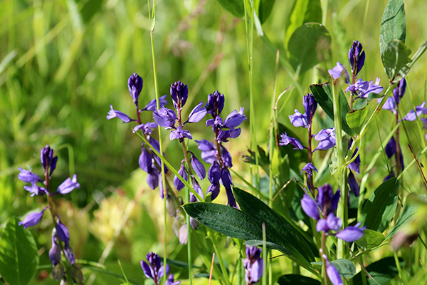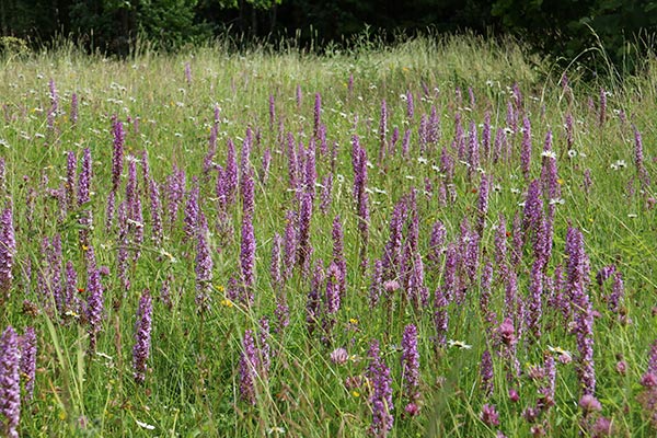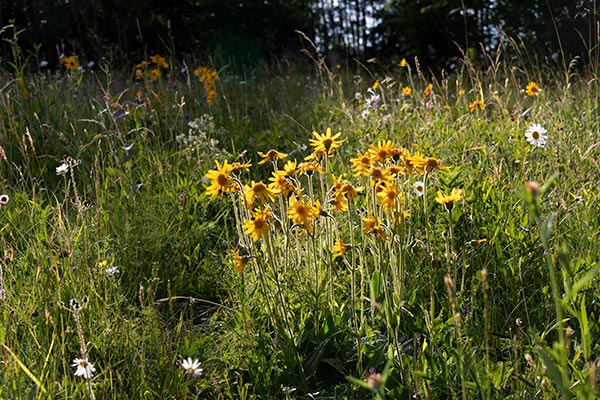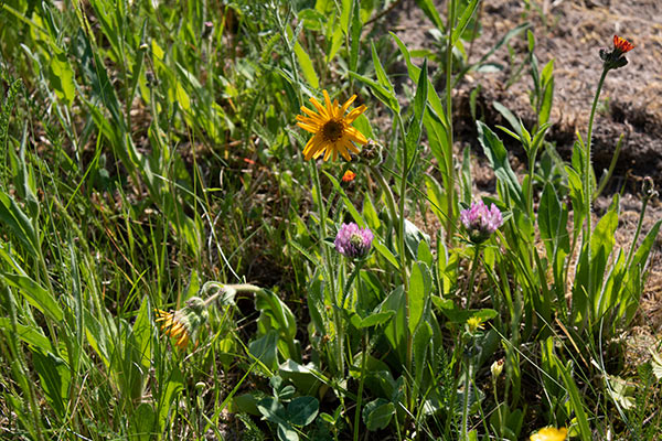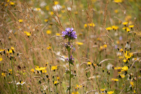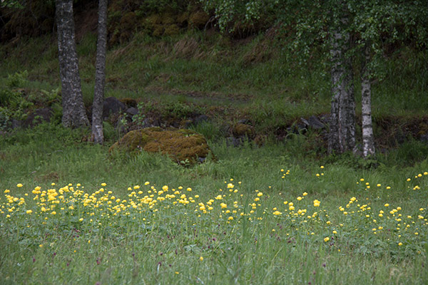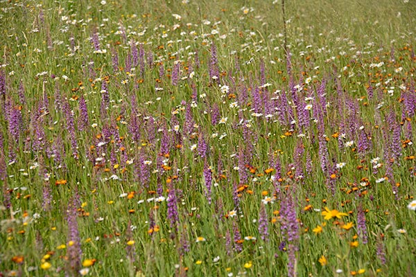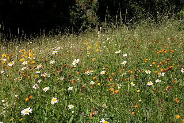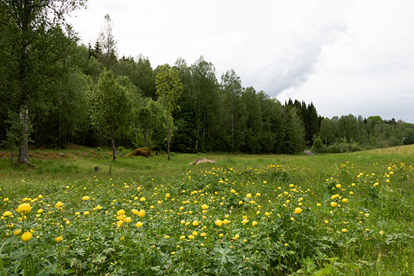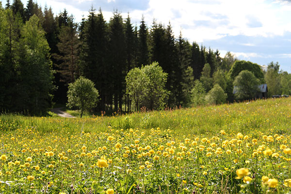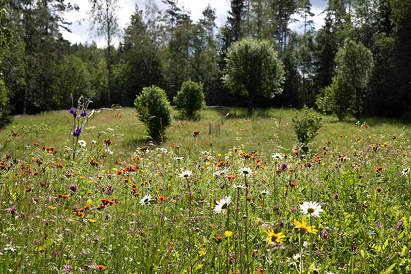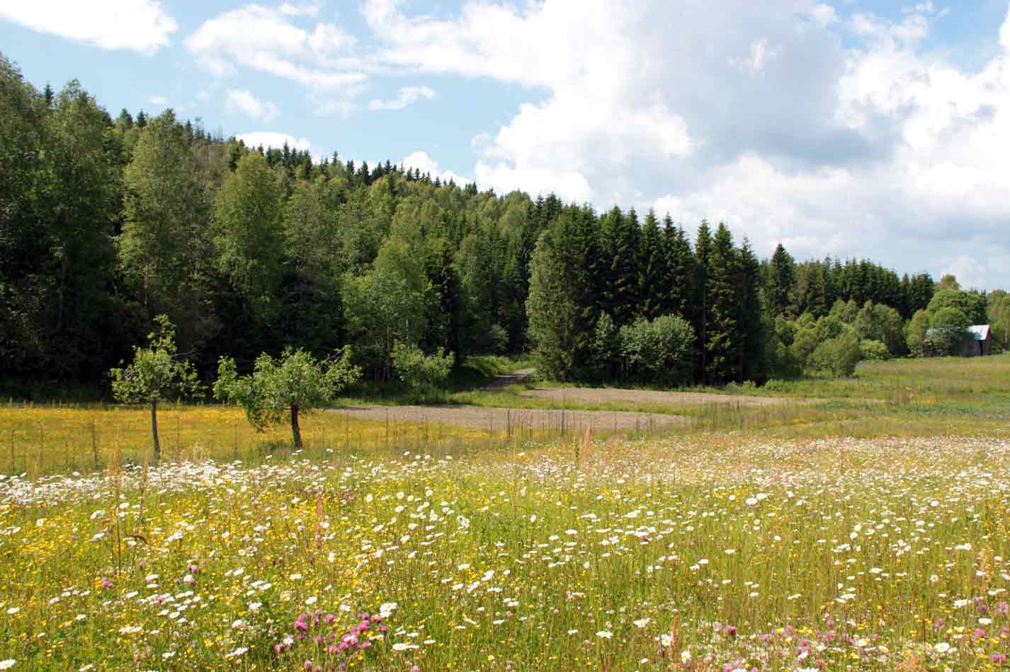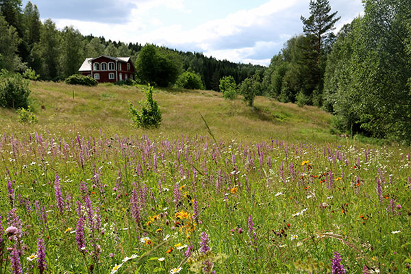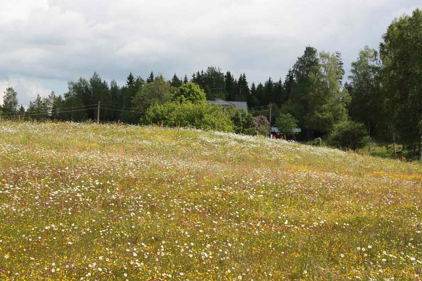 Blommande vall, ca 1 ha, framför huset, väster ut. |