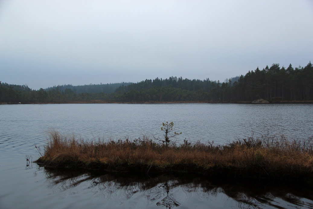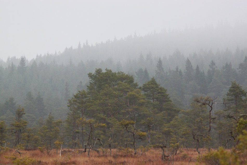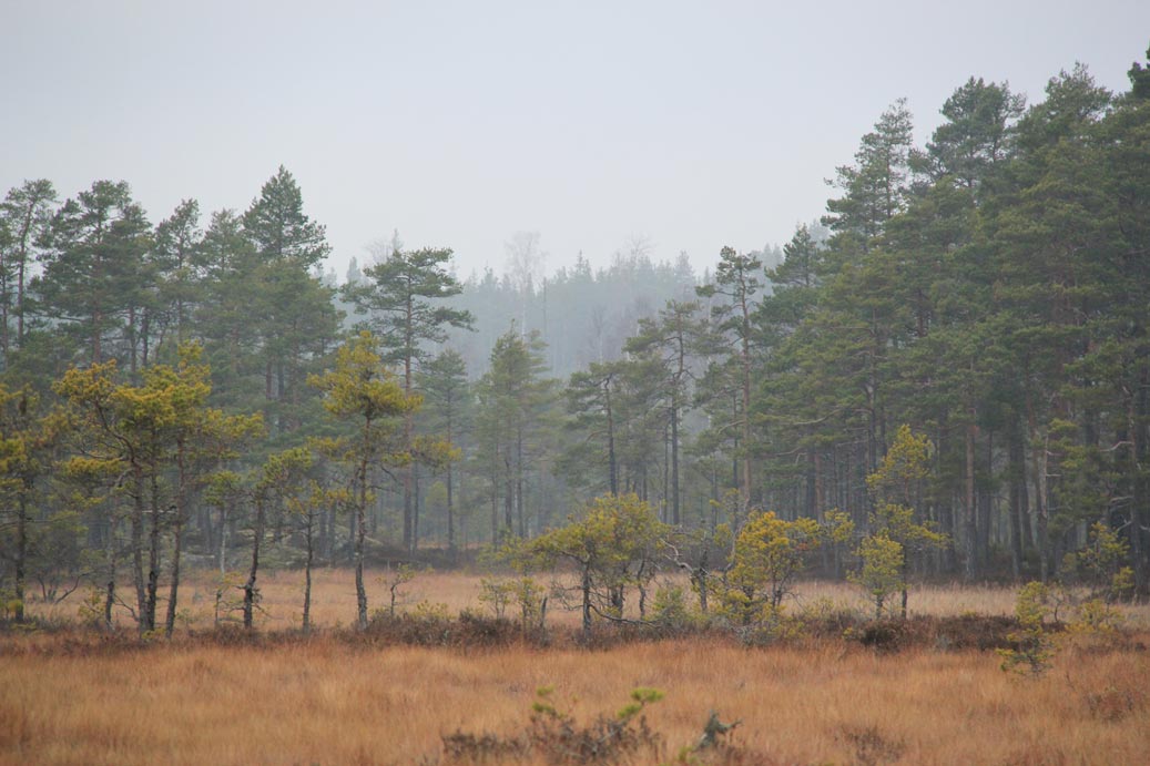 Någon varg såg jag inte i den täta dimman, som svepte som en kall ande i håret, allt var tyst och öde, även om jag såg ganska så gott om älgspår kring myrmosaiken. Skogen är inte skyddad i naturreservatet, men mycket har sparats ändå, särskilt kring mossarna och kant zonerna runt tjärnen. Hoppas att skogen kan få ett mer permanent skydd, för några av tallarna är vackra och börjar få en urskogskaraktär, även om de bara är i medelåldern för en tall.